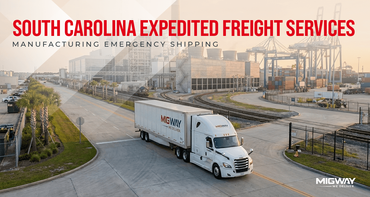 MigWay supports same-day and overnight freight across South Carolina including Greenville, Spartanburg, Columbia, Charleston, North Charleston, Florence, and Rock Hill.